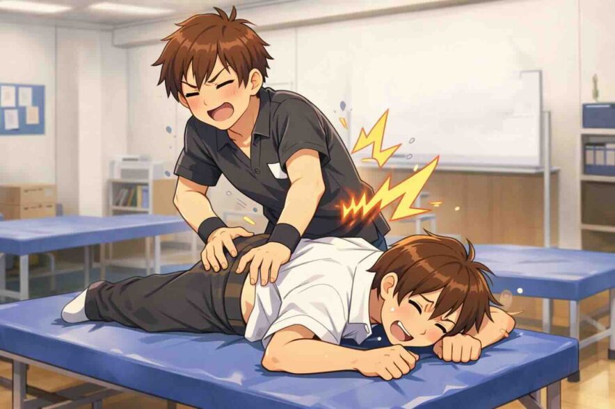 腰をかばいながら施術をしている人と、腰をかばいながらベッドに横になっている人。どちらも少し苦笑いしながら「ここ押してみて」「どう?」なんて確認している。そんな光景は整体スクールでは珍しくありません。
