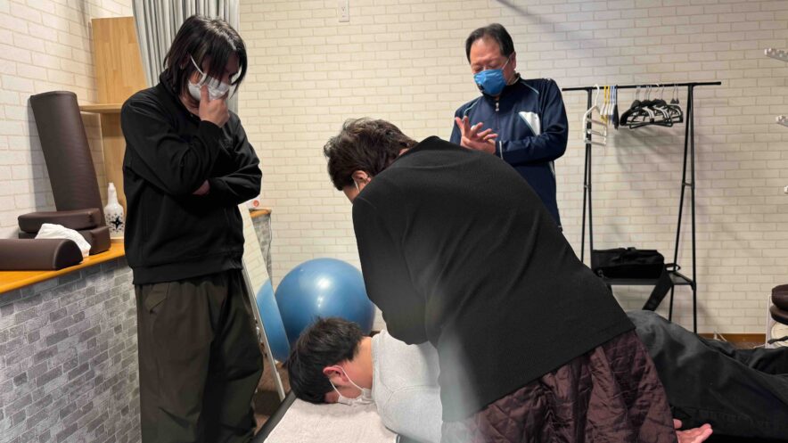 また、矯正のタイミングについても意識してもらいました。相手の筋肉の緊張や呼吸のタイミングを感じながら動作を行うことで、無理のない自然な矯正が行えるようになります。ペアでの練習を通して、相手の身体の反応を感じながら施術を行うことの大切さも少しずつ体感してもらえたように思います。
